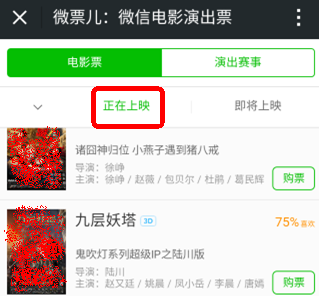 点击“电影票”打开。打开后默认的是当天“正在上映”的电影,如果需要购买当天以后的票,可以选择“即将上映”打开。