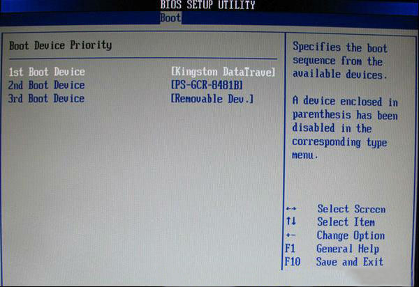 如果在图1-2的硬盘驱动器“Hard Disk Drives”里面还没选择U盘为第一启动设备,那么这里就不存在和显示U盘,如上图2-2所示,但可以选择移动设备“Removable Dev.”作为第一启动设备;