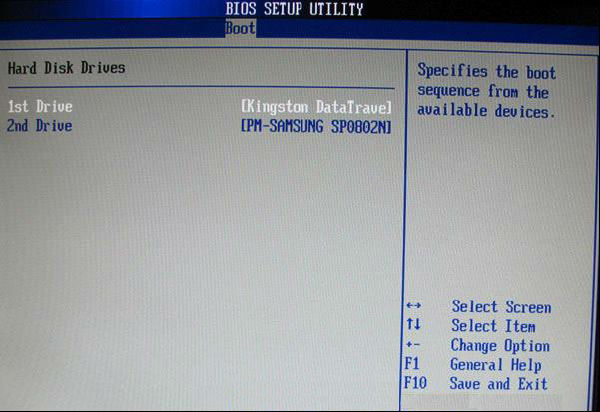 上图3-2 硬盘驱动器“Hard Disk Drives”选择:选择U盘为第一启动设备“1st Drive”。如果先在“Hard Disk Drives”里面选择U盘为第一启动设备,如图3-2所示,那么这里就会显示有U盘,那就选择U盘为第一启动设备,如图4-2所示。