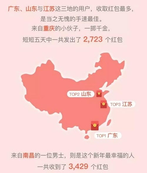 广东、山东与江苏三省用户抢得红包数量最多,分列一、二、三位;据统计,来自重庆的一个小伙子在过年期间一掷千金,短短五天内一共发出了2723个红包,而另一位来自南昌的人士则一共收到了3429个红包,一举打败神秘的“浙江女士”,成为了这个新年最幸福的人。