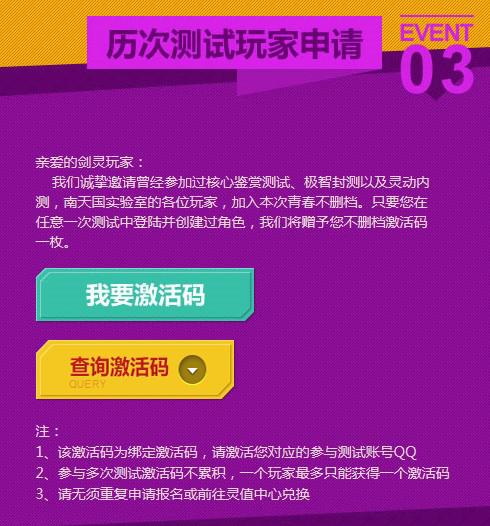 活动期间(10月15日-11月02日),心悦会员转发微博并@3位好友,邀请好友共赴剑灵,即可抽取青春不删档测试激活码(每个QQ只能获得1次激活码)