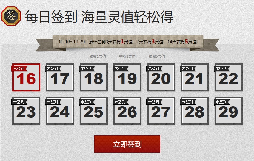每日签到=3天1灵值、7天3灵值,14天5灵值