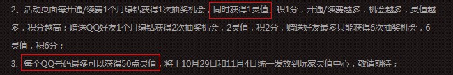 活动页面每开通/续费1个月绿钻获得1次抽奖机会,同时获得1灵值、积1分,开通/续费越多,机会越多,灵值越多,积分越高;赠送QQ好友1个月绿钻获得2次抽奖机会,2灵值,积2分,赠送好友最多只能获得6次抽奖机会,6灵值,积6分;