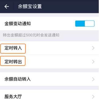 4、进入后可发现”定时转入、定时转出“两项功能,此两项功能非常好用。比如每月发了工资之后,及时转入到余额宝;每月的房租或车贷什么的,按时交代,不用担心误时。(说明一下:余额自动转入指的是支付宝的余额自动转到余额宝里。)
