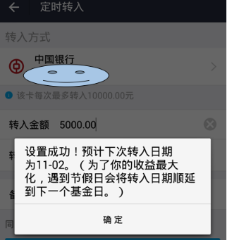 5、点击右侧”>“符号进入转入设置或转出设置,如下图,设置金额、日期、备注一下,方便后继查看,设置好后确认。