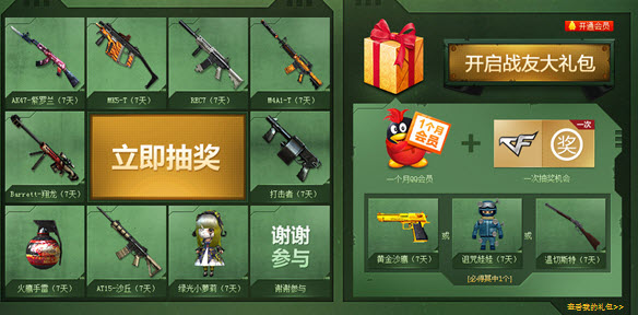 3、活动期间,每天在当前页面成功向10位CF好友发送游戏邀请,即可获得1次抽奖机会,QQ会员用户可额外获得一次抽奖机会。同时玩家也可以通过开通1个月会员获得战友大礼包,其中包含了1次抽奖机会以及战友大礼包中3个道具的其中1个。