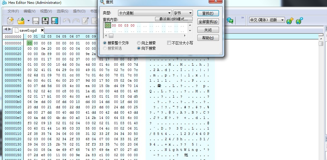 打开后,我们用搜索功能,切换成十六进制搜索(默认是普通数值搜索),阿甘城的话直接搜00 00 00 30 00如图