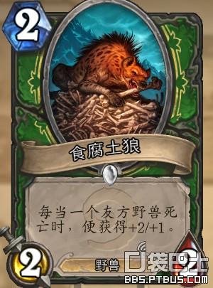 食腐土狼:猎人爆发流中的核心卡片,与上面那张卡简直绝配啊。不过同样是脆皮,属于一轮能够带走的那种,不要太早放上场。