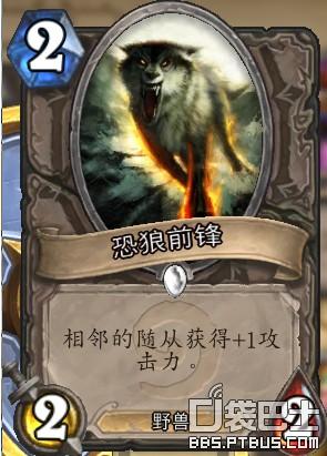 恐狼:猎人爆发流打法中的核心卡片,2血的他既能够进攻1攻的嘲讽怪,为其他的脆皮高攻打出足够的舞台,还可以为两个随从提供1点攻击力。