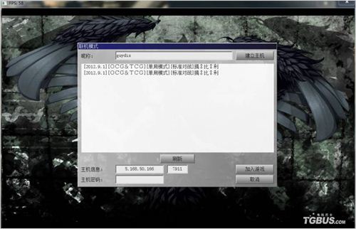 建立主机隔壁的昵称就是决斗中你的昵称,主机信息那行的两栏分别写上IP和端口(内网联机用,当然也存在hamachi这种联机方式),密码栏填写之后(如有密码)能按进入房间就能进入特定IP的主人所开的房间中,而在局域网下刷新能看到房间