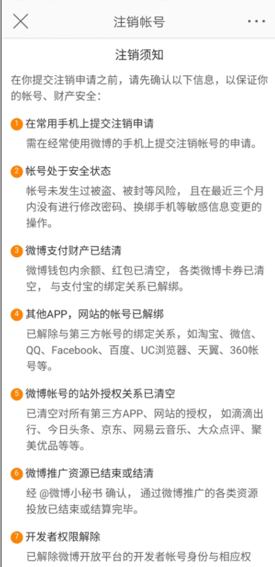 在这里,你会看到一份详细的“注销须知”,提醒你提交账号注销申请之前,必须确认满足7个条件: