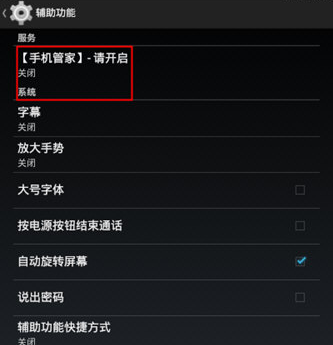 1、在“辅助功能”界面中,找到并点击“【手机管家】-请开启”一项;
