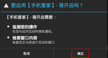 3、在“要是否【手机管家】-请开启吗?”界面中,点击界面右下角的“确定”,之后就可以使用腾讯手机管家一些附带的辅助功能了。