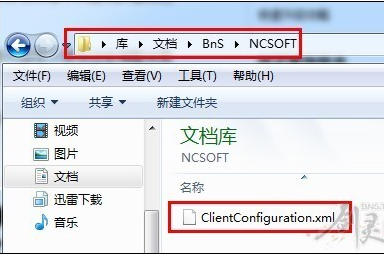 找到自己机器的配置文件:开始菜单-文档-BnS-NCSOFT-ClientConfiguration.xml