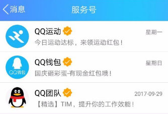 现在就可以看到服务号有三个选项,QQ运动 钱包和团队,选择第一项“QQ运动”就可以了;