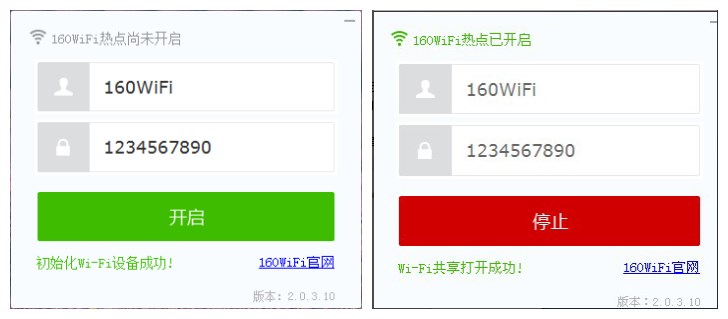 第二,界面简洁,无广告。打开160WiFi,主界面显示在桌面中央,界面很小。Wifi初始用户名和密码简单明了,要修改也容易,在未开启的时候,直接在界面上改动即可。全界面无广告,没有多余的logo,只专注一件事,努力使用户能够开启wifi共享。