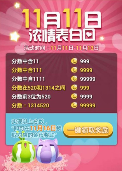 2、参与活动:11月11日-11月13日期间游戏分数中含有以下数字,均可在11月16日在游戏内的活动页面领取相应金币奖励。