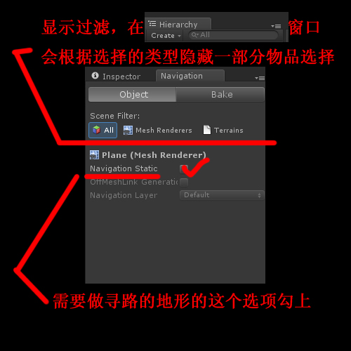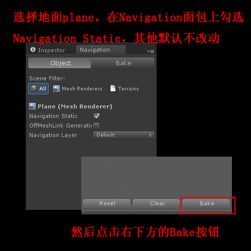 还记得刚开始介绍的Navigation面板吗?选择地面(plane),在Navigation面板里面里面勾选Navigation Static选项,其他的默认不改动。