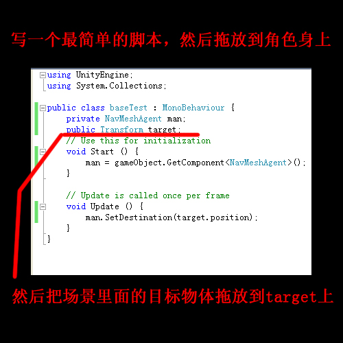 简单的解释一下,这个脚本是直接拖放到角色(man)身上的,并把场景中的目标物体(target)拖放指定到该脚本的target变量上面进行了赋值。在脚本一开始的时候,我 先获取了man身上的NavMeshAgent脚本组件,然后在Update的过程中,man不断的进行对target的位移的一个寻路并移动到目标位置的操作。