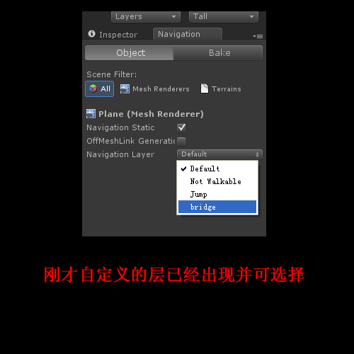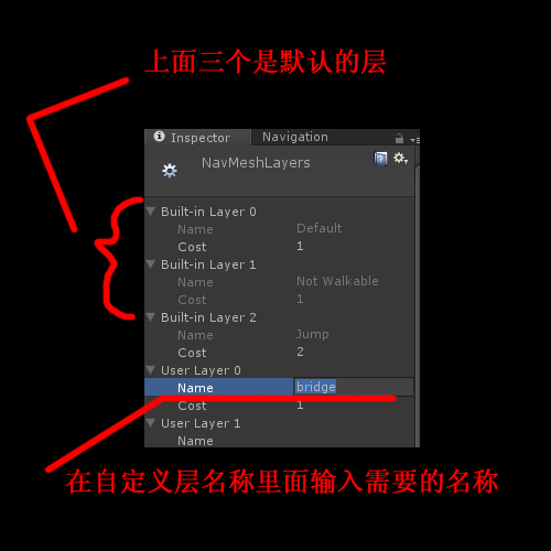 Navigation Layer是对参与寻路功能的地图物体的一个分类,用层来分类,默认有三个层可以选择,当然也可以自己添加层。