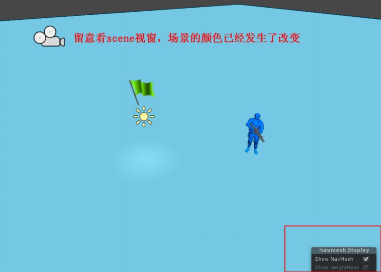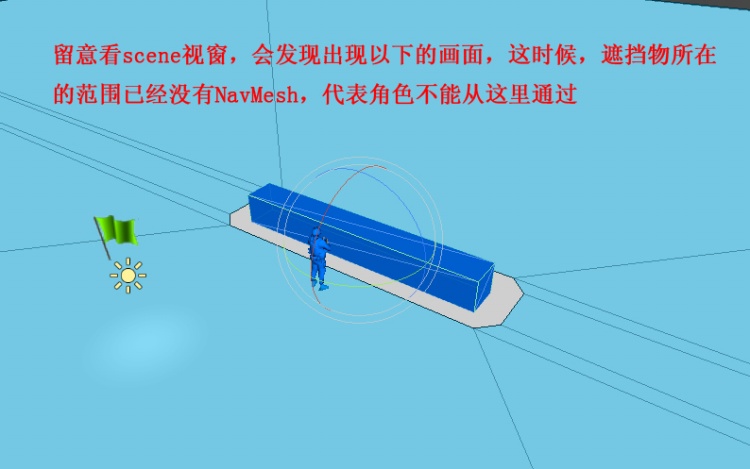 观察scene视窗,会发现刚才整个地面都是NavMesh的情况已经改变了,在障碍物的周围,NavMesh留出了一个缺口,这代表了角色已经不能从障碍物身上通过了。
