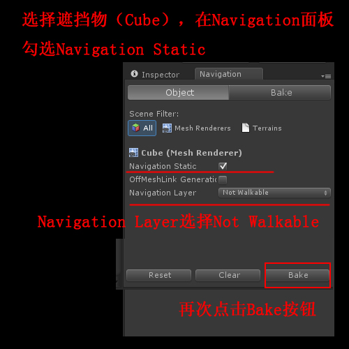和刚才对地面的操作差不多,选择遮挡物Cube,在Navigation面板里面勾选Navigation Static选项,这次的Navigation Layer要选择Not Walkable。顾名思义,这是不能行走的意思,代表了这个Cube是不能通过的。