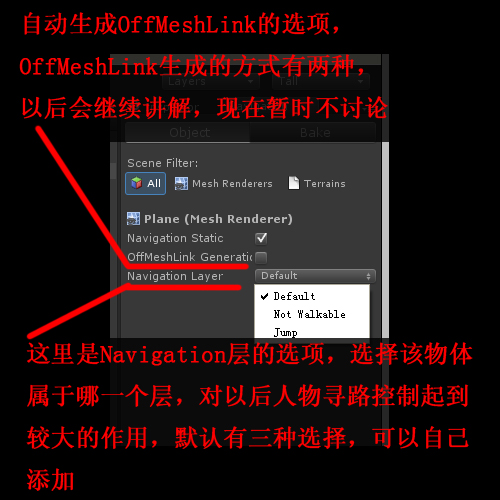 OffMeshLink Generation选项是选择该物体是否根据高度、可跳跃宽带等全局的选项自动生成OffMeshLink,这个会在以后的讲解中详细说明,这次就暂时不讨论。