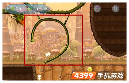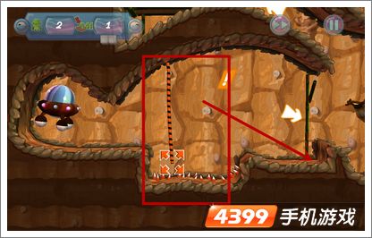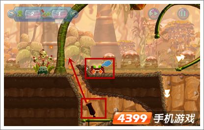1、首先绿色生物会走向绳子,用手指晃动绳子跳到对岸。注意不要被钉子刺到,当绳子到达对岸后双击屏幕,绿色生物会从绳子上下来。