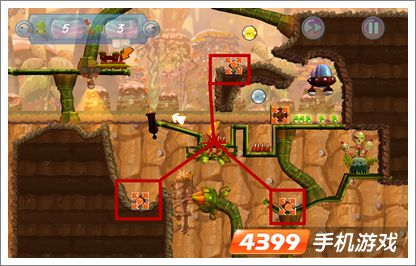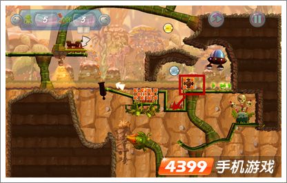 2、接下来就简单了,将木箱移到后面的路障中。绿色生物就会畅通无阻的过去,坐上大炮走向终点。