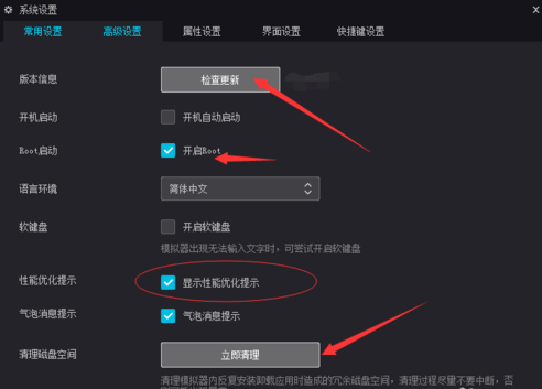 3.在玩游戏如果出现卡顿现象,其实更改手机型号解决的效果是有限的,你可以在常用设置一栏中,首先点击“检查更新”,确保你的软件是最新版本,这样会对游戏的支持效果好一点,然后在图示位置中的红圈部位进行设置一下,注意清理一下磁盘空间。
