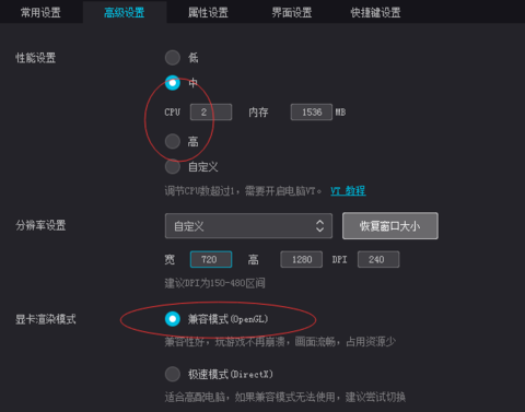 4.然后进入高级设置中,在这里你可以将你的软件系统设置为高配,以及cpu数量核心等进行设置,帧数以及显卡渲染设置等,以上这些设置对游戏的流畅程度非常的影响非常的大的。