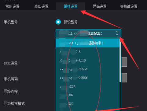 5.然后进入“属性设置”,在这里可以看到关于手机型号的设置,你可以进行如图所示的操作,然后选择一个比想要的手机型号,即可。
