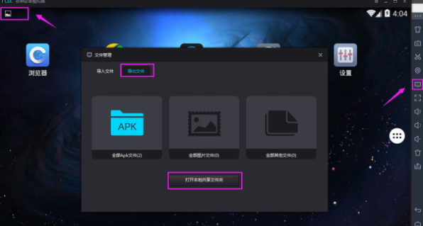 ②然后我们打开模拟器右侧的我的电脑按钮,导出文件-打开本地共享文件夹。