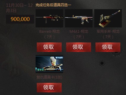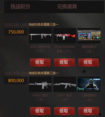 CFer达到规定的积分,可领取相应的道具,分为三个等级,最低800,000积分都可以领取MG3-银色杀手、M249 MINIMI-圣诞、雷霆道具卡,其他M4A1-狼牙、AK47-狼牙、幻影道具卡、Barrett-翔龙、军用手斧-翔龙等。