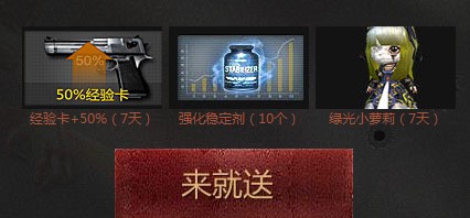 奖励如下:CFer来就送经验卡+50%(7天) 强化稳定剂(10个) 绿光小萝莉(7天)。