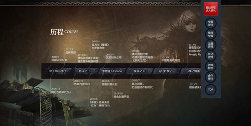 该站首页排版风格与腾讯旗下多款游戏产品官网索引页近似,主体部分由一部内嵌于页面的视频、一个滚动焦点图推荐位和一个新闻推荐列表构成,同时兼顾了直观表现、实时热点推送和详细资讯推送三大基本功能。而接下来的几个页面,内容则更加丰富,每一个子页面,都有一个明确,且独具特色的主题。例如,在以“历程”为主题的子页面里,通过一个清晰的时间轴,让玩家能够准确了解到腾讯旗下动作品类网游的发展历程。简单来说,整个页面便是一部腾讯动作品类的发展编年史。