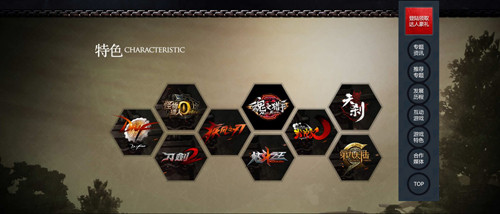 而在“特色”主题子页面里,则整齐排列着腾讯旗下九大动作品类网游的LOGO牌,鼠标指向任何一个LOGO牌,牌面翻转后,便可以看到其背面所描述的该产品核心特色。例如,腾讯旗下3D漫画风闯关动作网游《疾风之刃》,在翻开其LOGO牌时便会看到“3D动漫风超动作网游,一部可以玩的动漫片”这样的字样。而其余各款产品也同样如此。