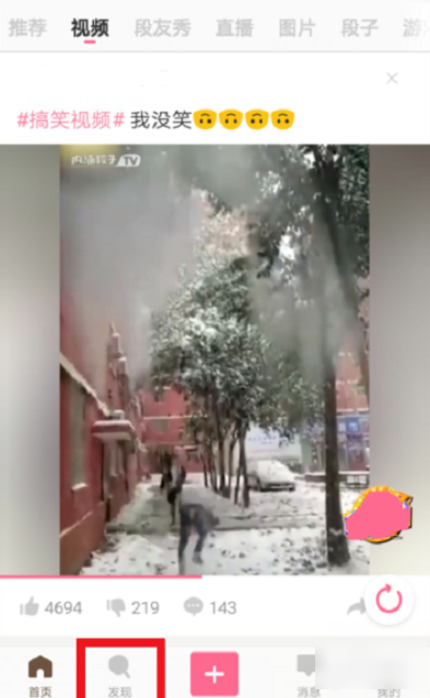 1.打开段子的主页面,在下面的一排字中,看到“发现”按钮并点击。