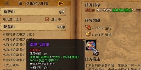 任务内容是魔鬼鱼的做法,为虾翁收集20个银角狰的鬃毛。任务奖励是移动速度3600的坐骑--缰绳.弋游虫。