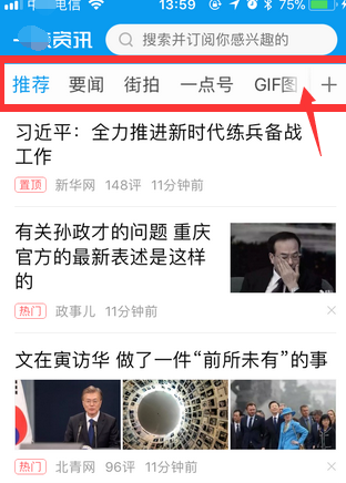 1.首先,在手机里找到一@点@资讯软件,点击打开它。打开软件后,你会看到在软件上方有个“推荐”栏,这里就是我们需要调整的地方。这里可以用手指进行向右、向左划动操作。如下图,箭头位置是我不需要,想要删除的频道。