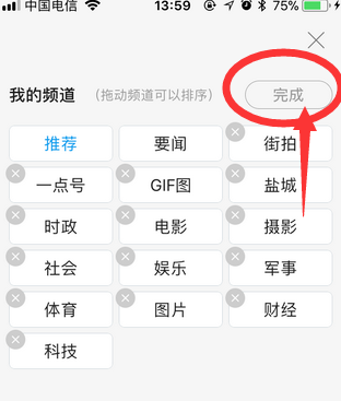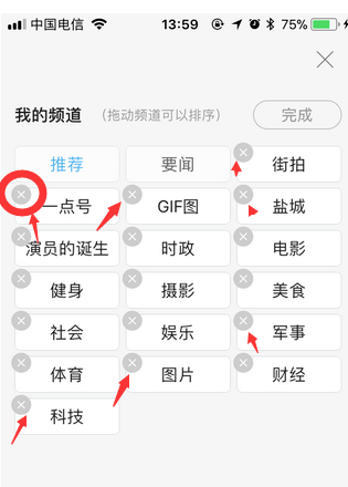 3.点击“我的频道”右侧“排序/删除”按钮,即可对在首页“推荐”里面的频道进行删除、排序和添加了。