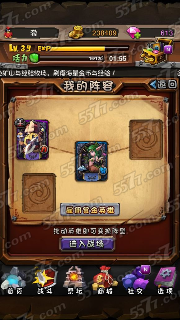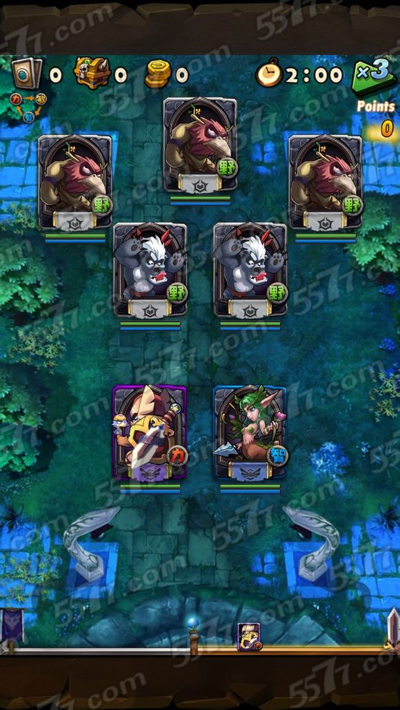 第一步,准备一个主力英雄和一个加血技能的一级英雄。(系统送的一级小鹿或者神灵就可以,主力英雄需具备有加血的时候可以过图,无加血的时候过不了图,楼主的搭配仅供参考。)