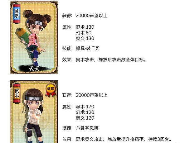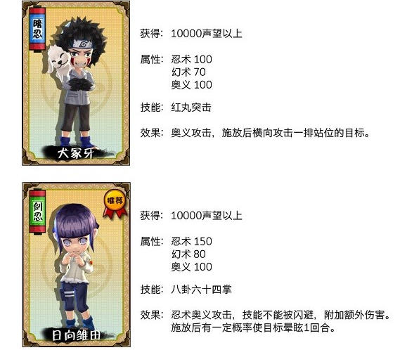 日向雏田:日向家族正统继承人,虽然潜力比不上哥哥,但技能却完爆哥哥,有木有啊!必定命中加额外伤害加概率眩晕!集控制伤害命中于一体,我还能说什么吗?评价:B
