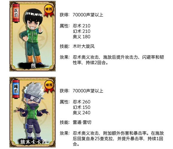 旗木卡卡西:卡卡sensei,目前最高初始三围的忍者,有木有啊!超越了初代的卡卡sensi,还会不好用吗?那暴击爽死你!超高伤害,获取条件高,但谁不用谁傻子!评价:S