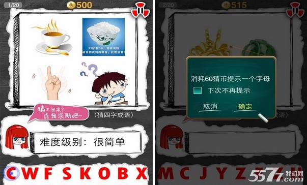 至于画面方面小编相信大家都知道腾讯美工天下闻名,就不要质疑画面的精美性了。还是来说说它的操作性吧,游戏操作很方便和疯狂系列的操作大径相同。只需要填写正确答案的首位字母即可,也有提示环节,但是需要金币,所以小编还是推荐大家尽量自己猜吧。因为提示好贵的需要耗费大家60猜币。