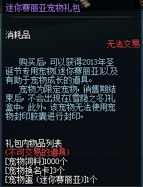 购买后可以获得2013年圣诞节专用宠物迷你赛利亚以及有助于宠物成长的道具,宠物为限定宠物,销售期结束后,不会出现在雪隐之冬礼盒中,此外,该宠物无法使用宠物封印胶囊进行封印。