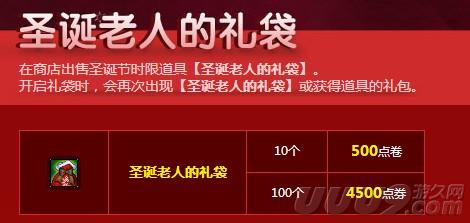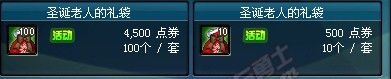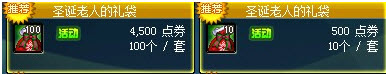 圣诞老人的礼袋售价为4500点劵/100个,500点劵/10个。