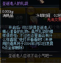 开启后,可以获得圣诞老人精心准备的礼物,虽然礼袋的摸样很奇怪,不过也许里面会有什么惊喜呢?快打开看看吧!(未使用的道具将于2014年1月22日凌晨6点全部删除)