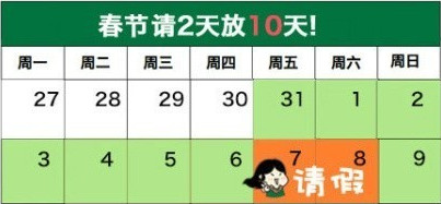 春节正常点的公司还是会给员工放除夕这一天的,那么大家只需要在7、8号请假即可拼出十天的春节假期哦!
