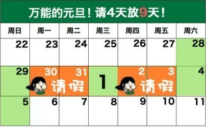 2014拼假攻略:元旦请假4天,火速变成9天小长假,春节请假2天,“延长”为10天长假,五一请假3天,8天长假诞生!若十一还能请3天假!哇!11天奢华长假!
